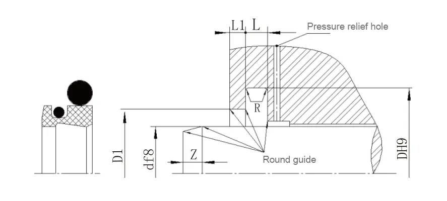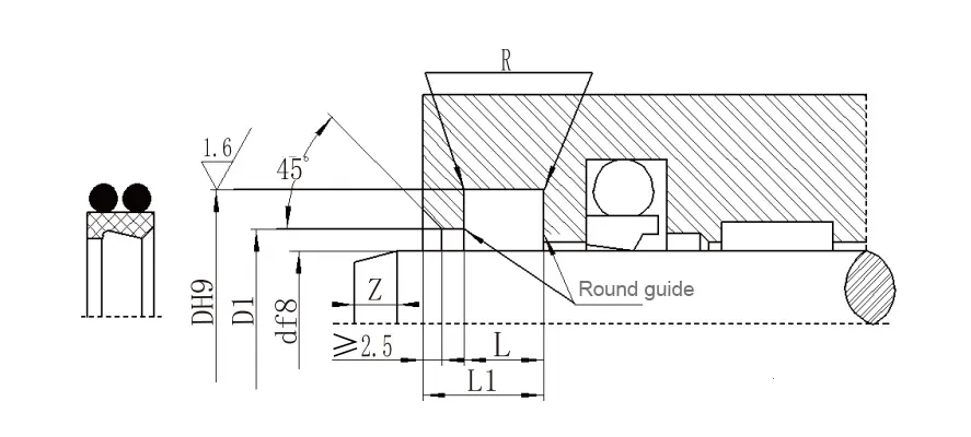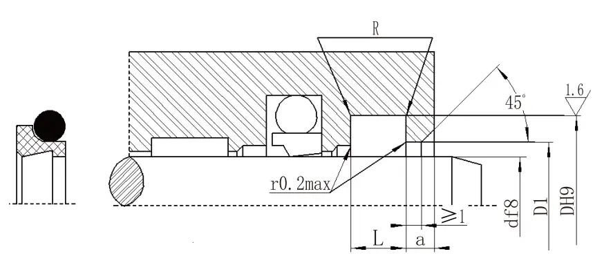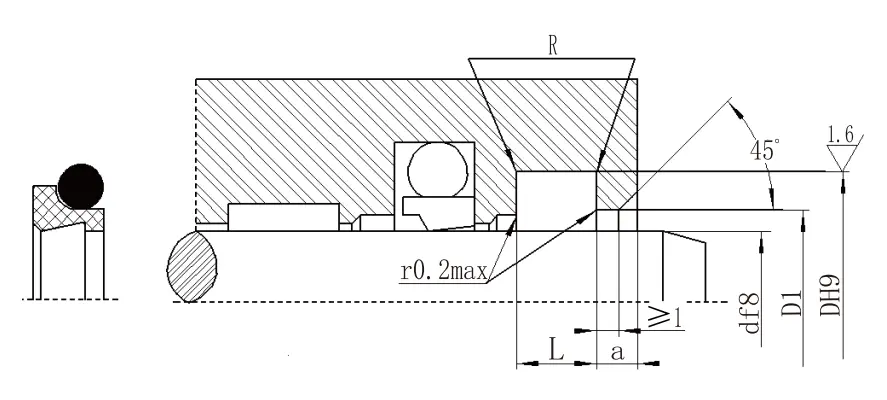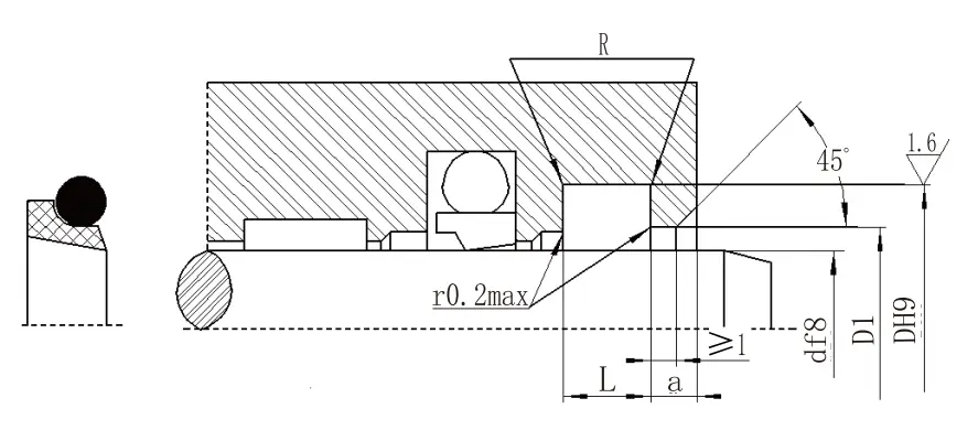 Zakres średnicy wału D F8 | Średnica groove DH9 | Średnica kroku D1 H11 | Szerokość groove L+0.2 |