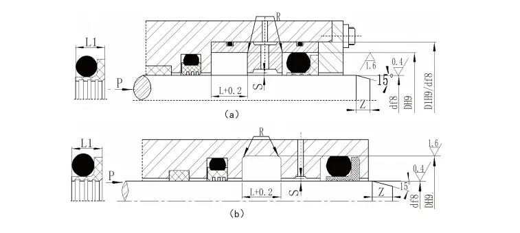 | 2. W przypadku uszczelnienia obrotowego zaleca się, aby twardość powierzchni wału obrotowego wynosiła HRC ≥58. 3. W przypadku ciśnienia większego niż 30 MPa zaleca się H8/F8 dla przerwy wytłaczania. | ||||||||||
