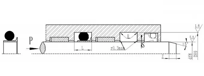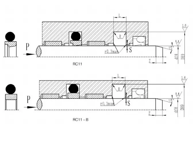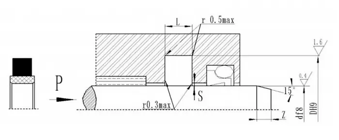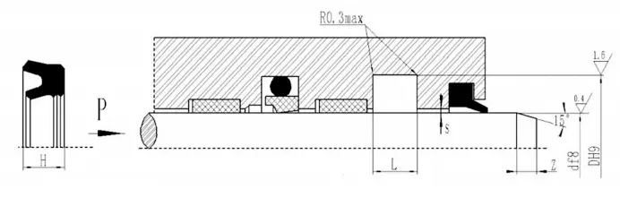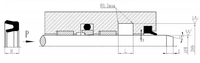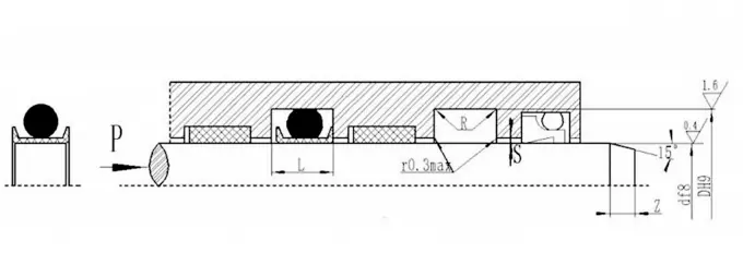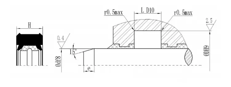 RC15 składa się z zestawu (więcej niż 3) pierścieni uszczelniających w kształcie litery V, pierścienia ciśnieniowego i pierścienia podporowego, i nadaje się do hydraulicznego ruchu w jedną stronę. Smar kompatybilny z materiałem uszczelniającym należy zastosować podczas instalacji. Nie można go zainstalować w zintegrowanym (zamkniętym) rowku. Cechy: