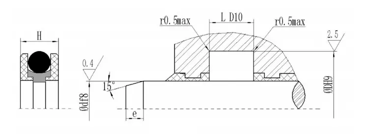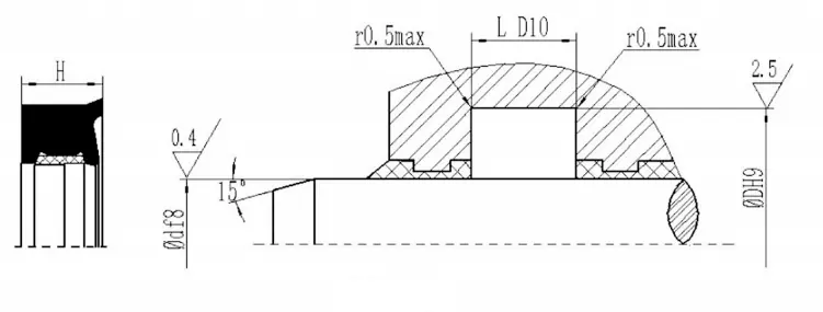 | Średnica pręta DF8 | Groove zewnętrzna średnica DH9 | Szerokość gniazda L D10 | Wysokość pieczęci H |