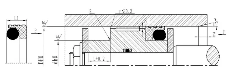 | Zakres przysłony Typ standardowy D H9 RC2062 | Zakres przysłony Ciężki typ D H9 RC2062-Z | Średnica groove D H9 | Szerokość groove L+0.2 | Szerokość pieczęci L1 | Okrągłe zakręty rMax | Radialny prześwit sMax | Ścięcie Zmin | Średnica drutu o-ring | ||